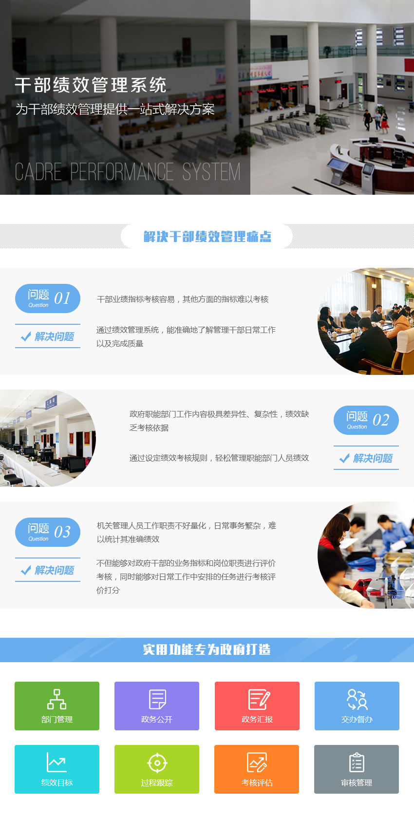 部门管理、政务公开、政务汇报、交办督办、绩效目标、过程跟踪、考核评估、审核管理